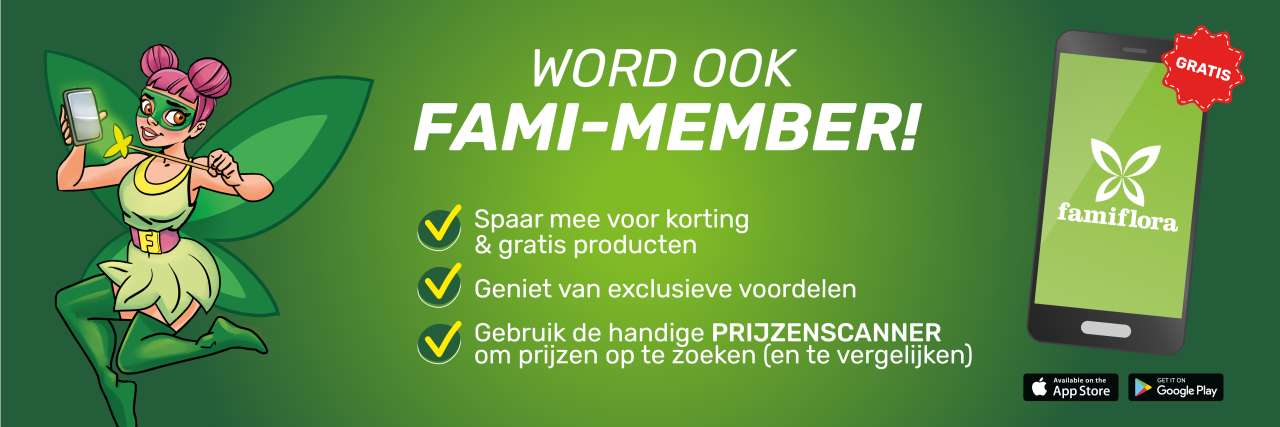 Je ontvangt voor elke euro die je uitgeeft 2 Fami-spaarpunten. Je kan je spaarpunten verzilveren voor kortingsbonnen of andere leuke beloningen. Voor 150 Fami-punten ben je bijvoorbeeld al trotse bezitter van onze handige Famiflora shopping tas! Maar er valt nog heel wat meer te krijgen, check snel de rubriek 'Beloningen' in de app.