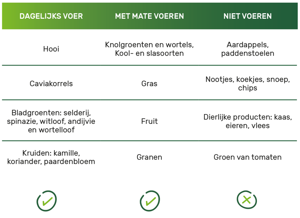 • Een dagelijkse portie vers hooi is een must: belangrijk voor de spijsvertering en de slijtage van de tanden.