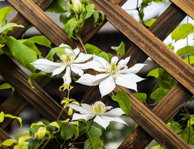 Parmi les plantes grimpantes, on distingue les véritables grimpeurs de ceux qui ne font que pendre. La première catégorie regroupe le lierre, l'hortensia et la vigne. Ces plantes s'accrochent à l'aide de crampons ou de ventouses et n'ont donc pas besoin d'aide. Les plantes qui pendent forment un plus large groupe. Les espèces les plus connues sont la clématite, le chèvrefeuille et la glycine. Ces variétés grimpent à l'aide de vrilles et nécessitent le soutien d'un treillis ou d'une structure métallique. Vous trouverez tout ce dont vous avez besoin pour cela dans votre jardinerie. Il existe d'autres variétés telles que les rosiers et les mûriers, qui utilisent à l'état sauvage leurs épines pour s'accrocher à d'autres plantes. Si vous souhaitez les faire pousser contre un mur ou un treillis, vous allez devoir les y attacher régulièrement.