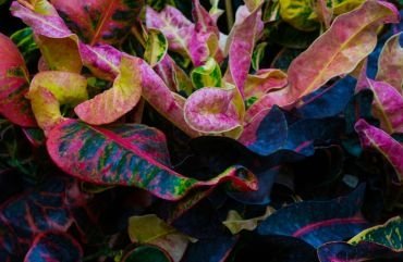 Croton, aussi appelé buisson miracle. Cette plante d'intérieur est un véritable accroche-regard qui peut atteindre plus de deux mètres de hauteur. Les feuilles panachées sont de presque toutes les couleurs de l'arc-en-ciel : jaune, rouge, orange et même violet. La plante tolère bien la lumière directe du soleil, elle est donc bien dans un endroit près d'une fenêtre. Gardez le sol légèrement humide.