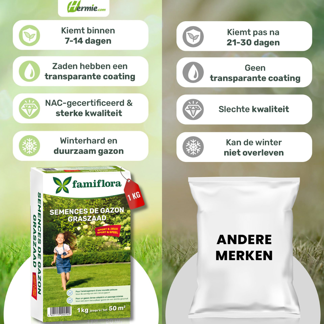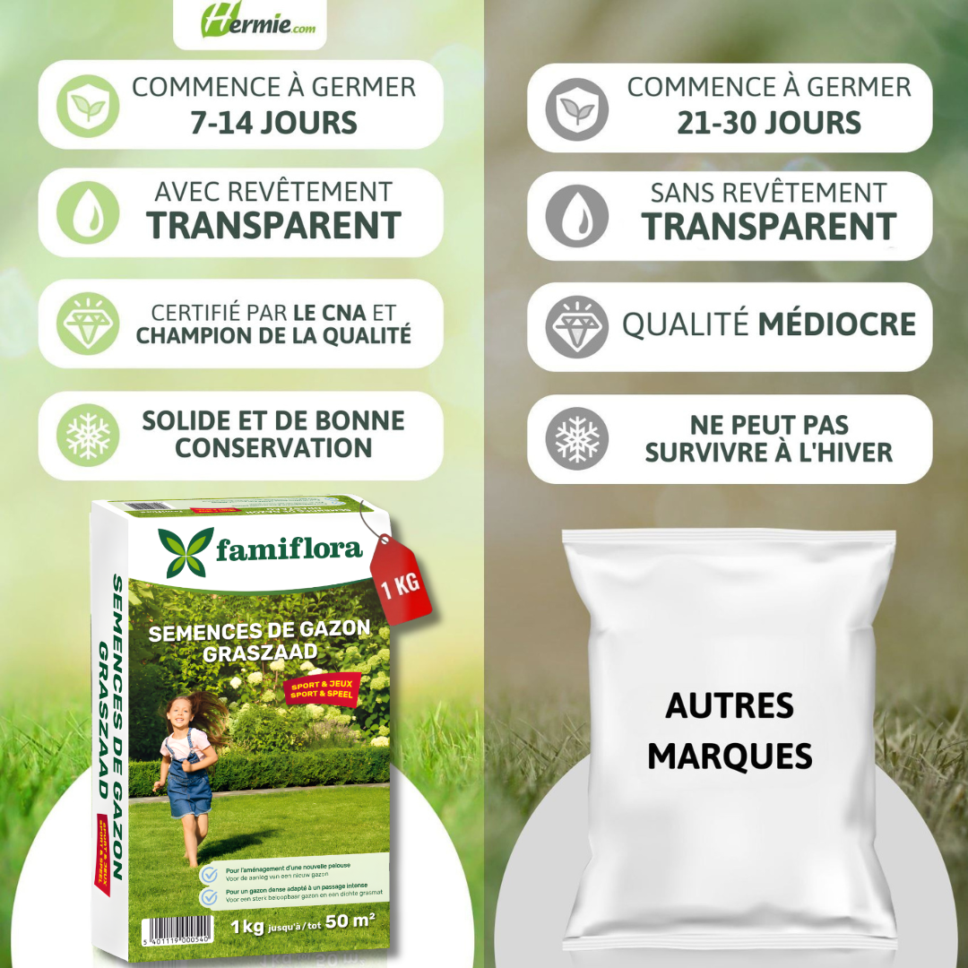 Les semences de gazon Famiflora pour pelouse de jeu et pelouse sportive sont composées à 50 % de ray-grass anglais ou de Lolium Perenne. Cela permet une levée rapide entre 7 et 14 jours, en fonction des conditions climatiques (20°C = idéal pour une levée rapide).
