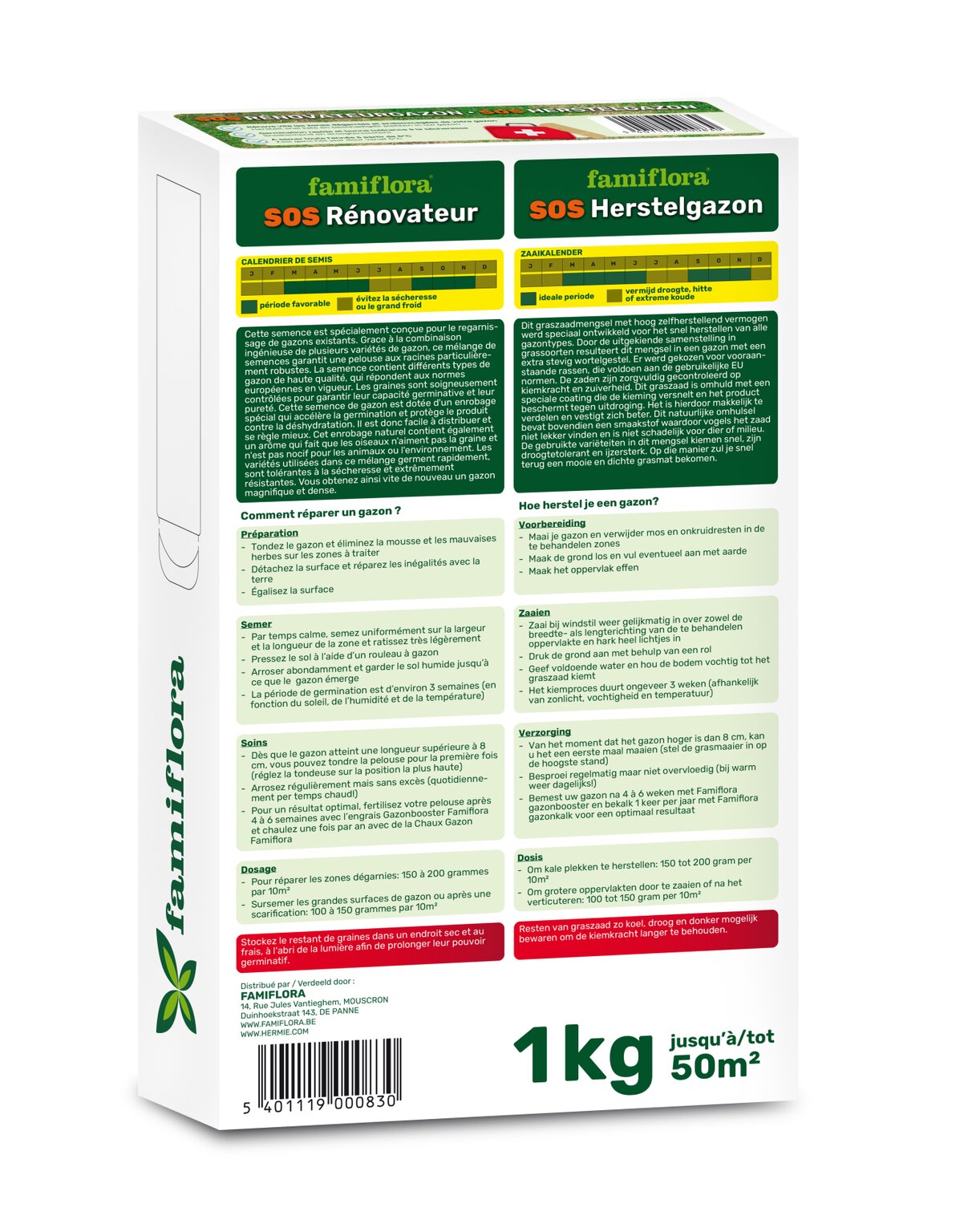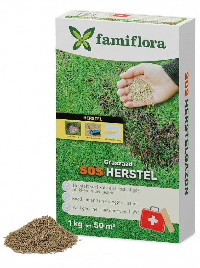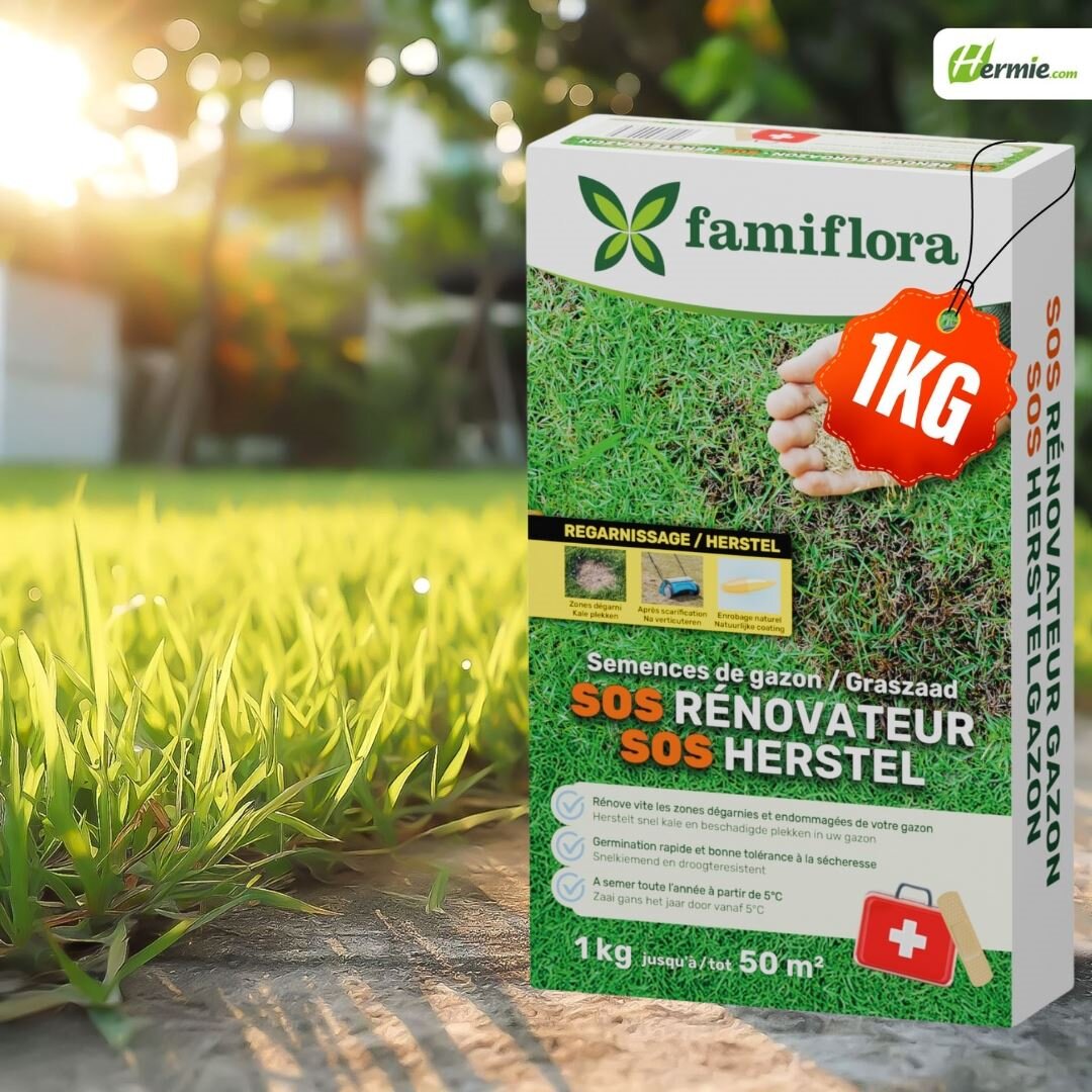 Lessemences de gazon de réparation Famiflora SOS sont spécialement conçues pour la réparation et le sursemis d' une pelouse existante. 🌱