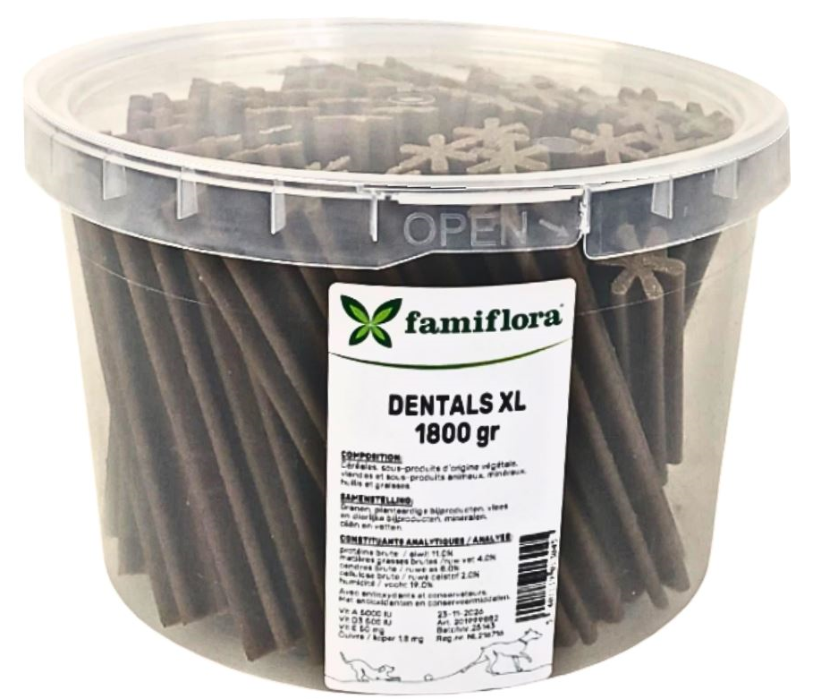 Votre ami à quatre pattes est-il un vrai champion de la mastication ? Avec Famiflora Dentals XL, vous obtenez la friandise parfaite pour les chiens de taille moyenne et grande. Ces bâtonnets d'environ 14 cm sont spécialement conçus pour les grandes mâchoires et offrent une expérience de mastication délicieuse qui fera à coup sûr remuer la queue de votre chien. Grâce au seau pratique de 1,8 kg (pour environ 50 bâtonnets), vous aurez toujours une réserve prête à récompenser votre chien de manière responsable. 🐕🦺