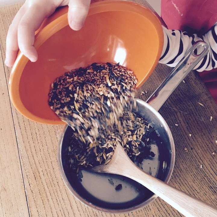 - Voeg daar al roerend het zadenmengsel toe en laat dit mengsel een beetje afkoelen.