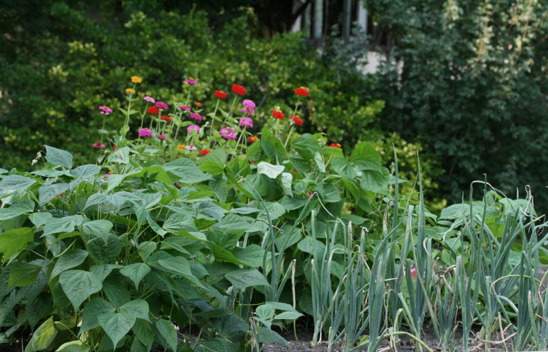 Je hoeft ook niet altijd alle groenten netjes op een rijtje te zetten. In een kleine moestuin kunnen ze gerust door elkaar staan.