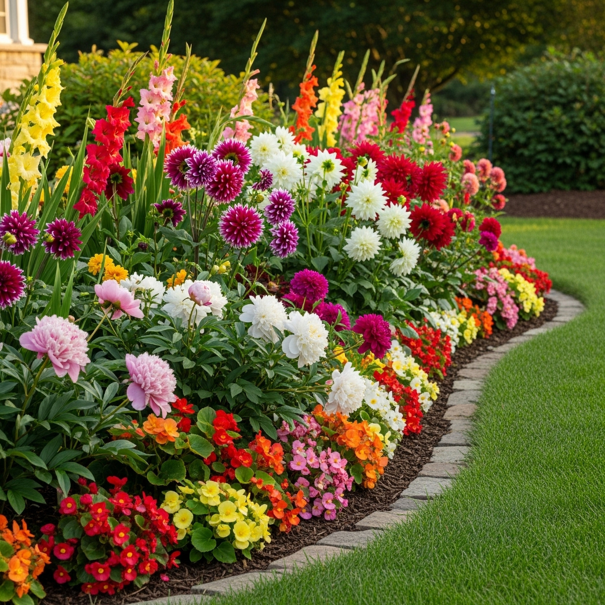 - Romantisch palet: roze, wit en lavendel dahlia’s, afgewisseld met zachte begonia’s. Perfect voor een dromerige, zachte tuin waar je helemaal tot rust komt.