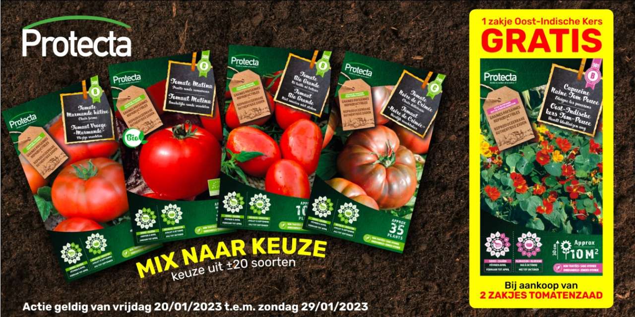 Iedere klant die twee of meer zakjes tomatenzaad van Protecta aankoopt, ontvangt gratis één zakje Oost-Indische kers. Opgelet: voor elke klant is er één zakje.