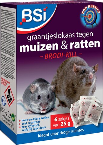 Dit krachtig en gebruiksklaar lokaas in graanvorm is geschikt voor de bestrijding van huismuizen (binnenshuis) en ratten (binnen en buiten rond gebouwen). Dit gif is op basis van de actieve stof Brodifacoum. Deze verpakking bevat 6 graanlokaas zakjes van 25g.