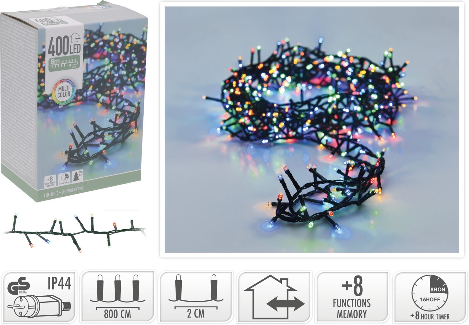 Met zijn 400 multicolor ledlampjes zorgt dit verlichtingssnoer voor sfeer in je kerstboom! Ideaal voor de kerstliefhebber die wel van wat kleur (en kitsch) houdt! De microclusterlampjes zijn op een speelse manier verdeeld over het snoer & staan dichter bij elkaar dan bij klassieke kerstlampjes (2 cm). Dat zorgt voor een feeëriek effect in je (oh) dennenboom! Het snoer (8 m) heeft een donkergoene kleur zodat deze gecamoufleerd wordt in je boom. Zo springen de lampjes nog meer in het oog & zorgen ze voor lichtpuntjes (letterlijk!) tijdens de donkere winterdagen.