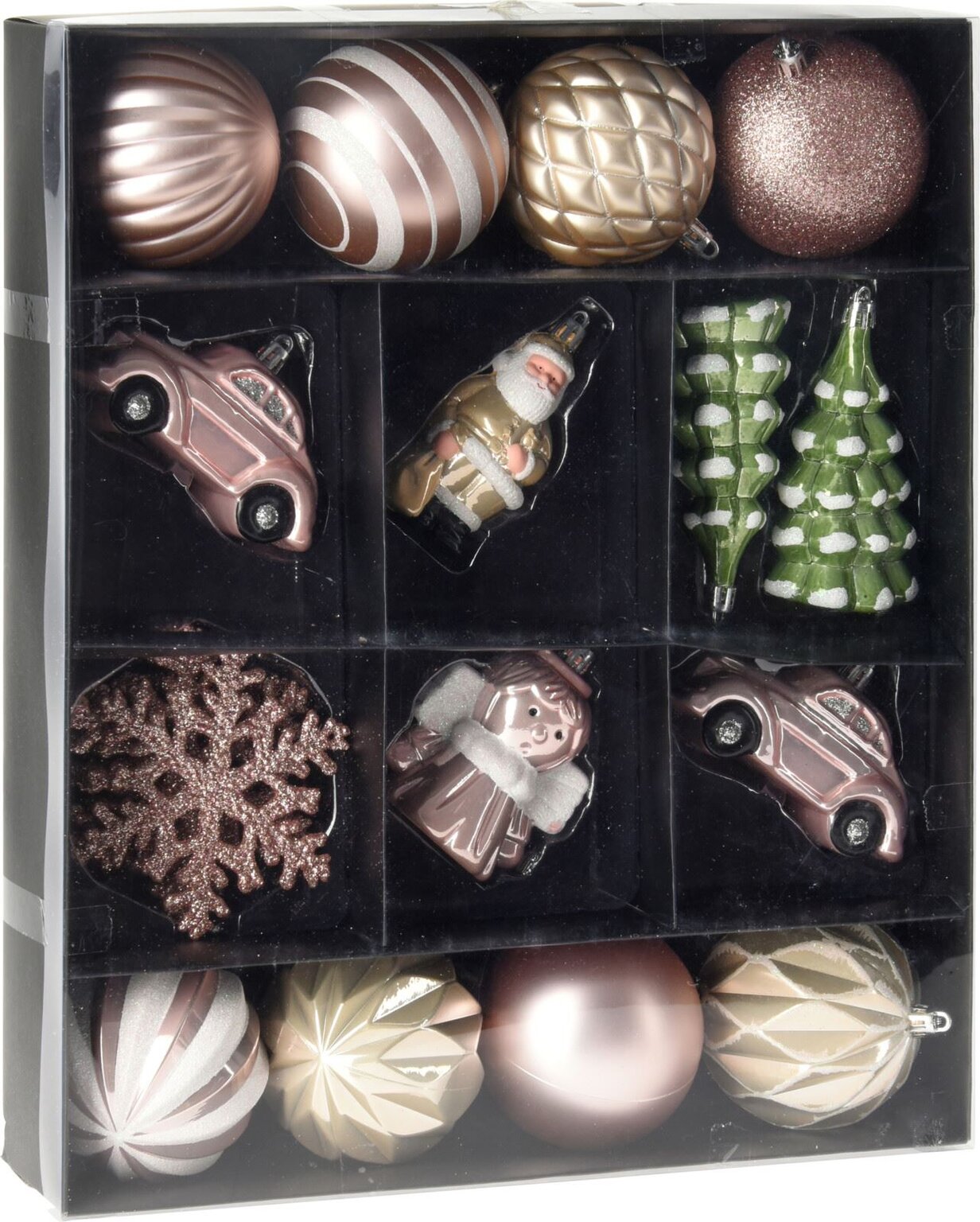 Deze set bestaat uit 20 prachtige roze ballen & ornamenten die in het kerstthema passen. Een mix van verscheidene figuren maar ook van blinkende, matte & feestelijk glinsterende ornamenten. Zo heb je alles in huis om je kerstboom in een feestelijk jasje te steken. Dat is handig!