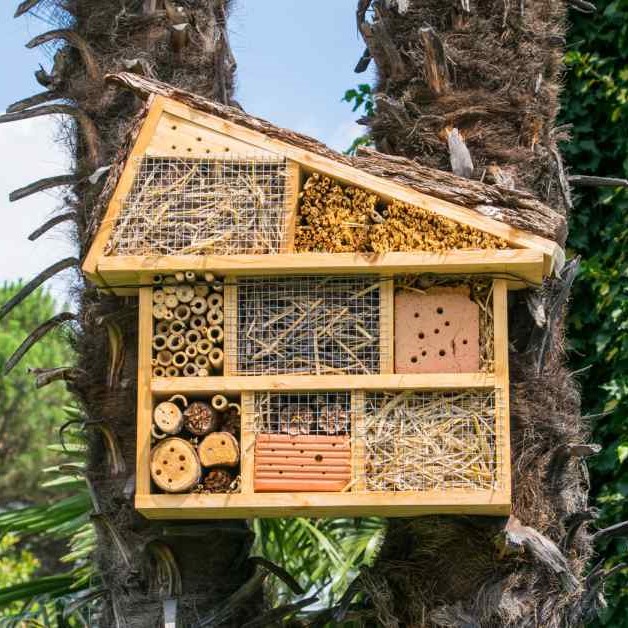 Je kunt de bijen ook helpen door een nestkast in je tuin te plaatsen, beter bekend als een bijenhotel. Zo’n bijenhotel kan je kant-en-klaar kopen in ons tuincentrum, maar je kan het ook zelf maken. Ga aan de slag met simpele materialen zoals rietstengels, bamboestokjes of houtblokken en boor er gaatjes van verschillende groottes in. Het is daarbij wel belangrijk dat alles mooi glad wordt geschuurd, zodat de vleugels van de bijen niet blijven steken. Alles moet bovendien goed vastzitten en aan de achterkant dicht zijn om te voorkomen dat vogels bij de bijenlarven kunnen. Voorzie tenslotte ook een waterdicht afdakje tegen regenwater. Je kunt het hotel zo klein en groot maken als jij wilt. De beste plek om je hotel neer te zetten, is een zonnige plek met de opening naar het zuiden en in de omgeving van bijenvriendelijke bloemen.